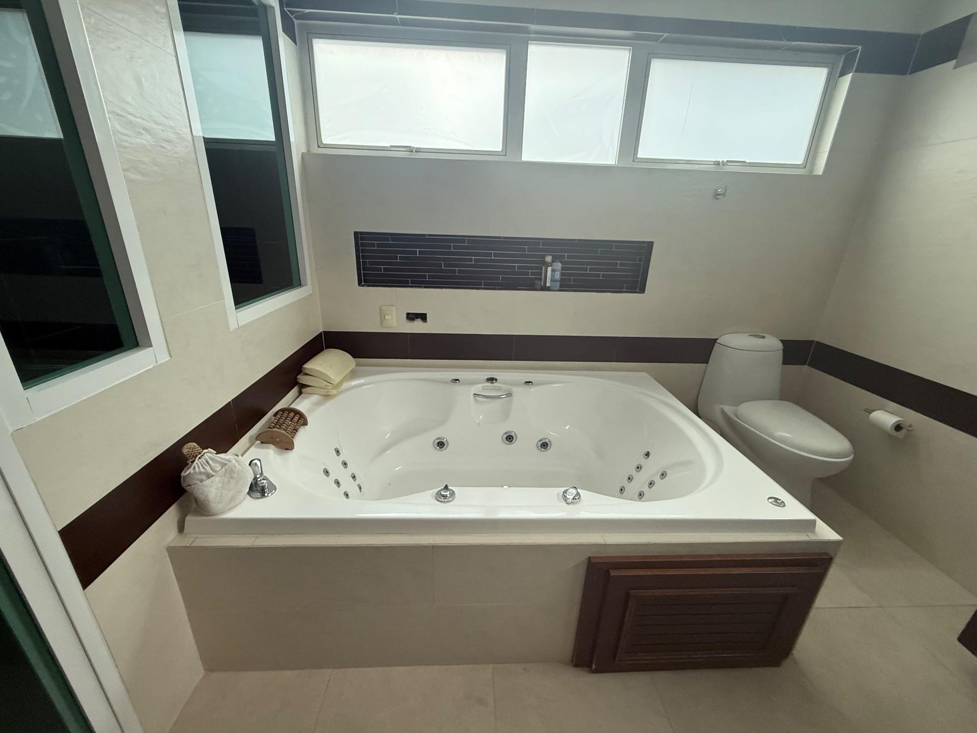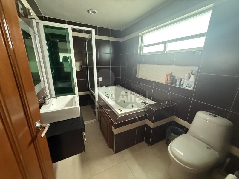 Cuenta con cuatro amplias habitaciones, cada una con vestidor y baño completo, dos de ellas con jacuzzi. La recámara principal incluye balcón y espacio para sauna. En total, la casa dispone de cinco baños completos y tres medios baños.