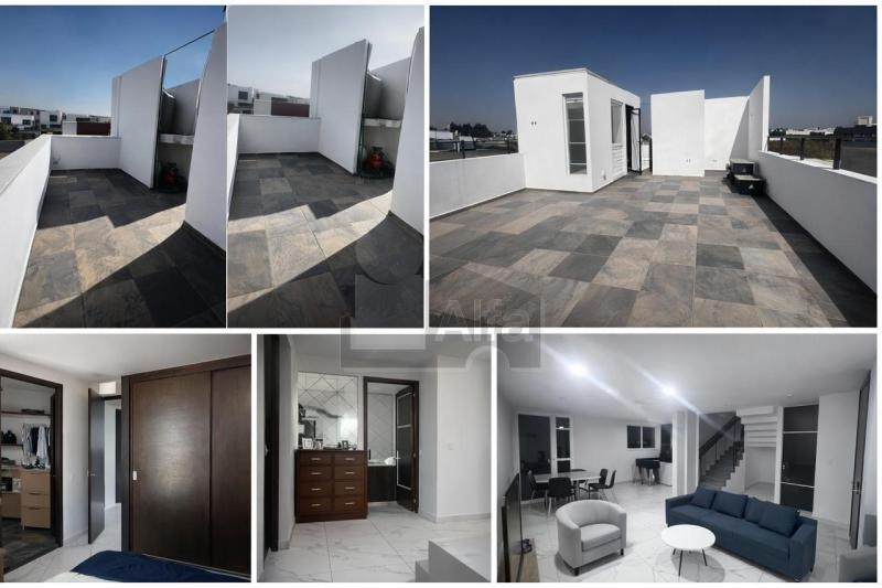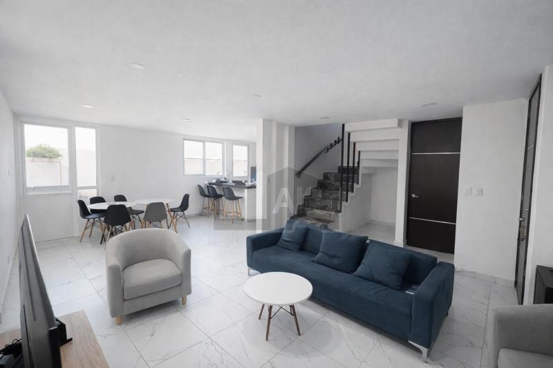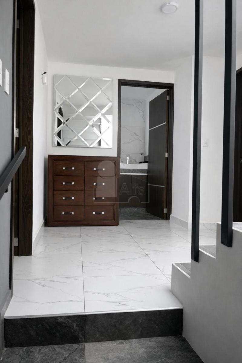 La propiedad se distribuye en tres niveles. En planta baja cuenta con medio baño, sala, comedor, cocina abierta y jardín trasero. En el primer piso se encuentran tres recámaras; la principal dispone de baño completo y vestidor, mientras que las otras dos recámaras comparten baño. En el tercer nivel ofrece un roof garden ideal para reuniones, medio baño y área de lavado techada.